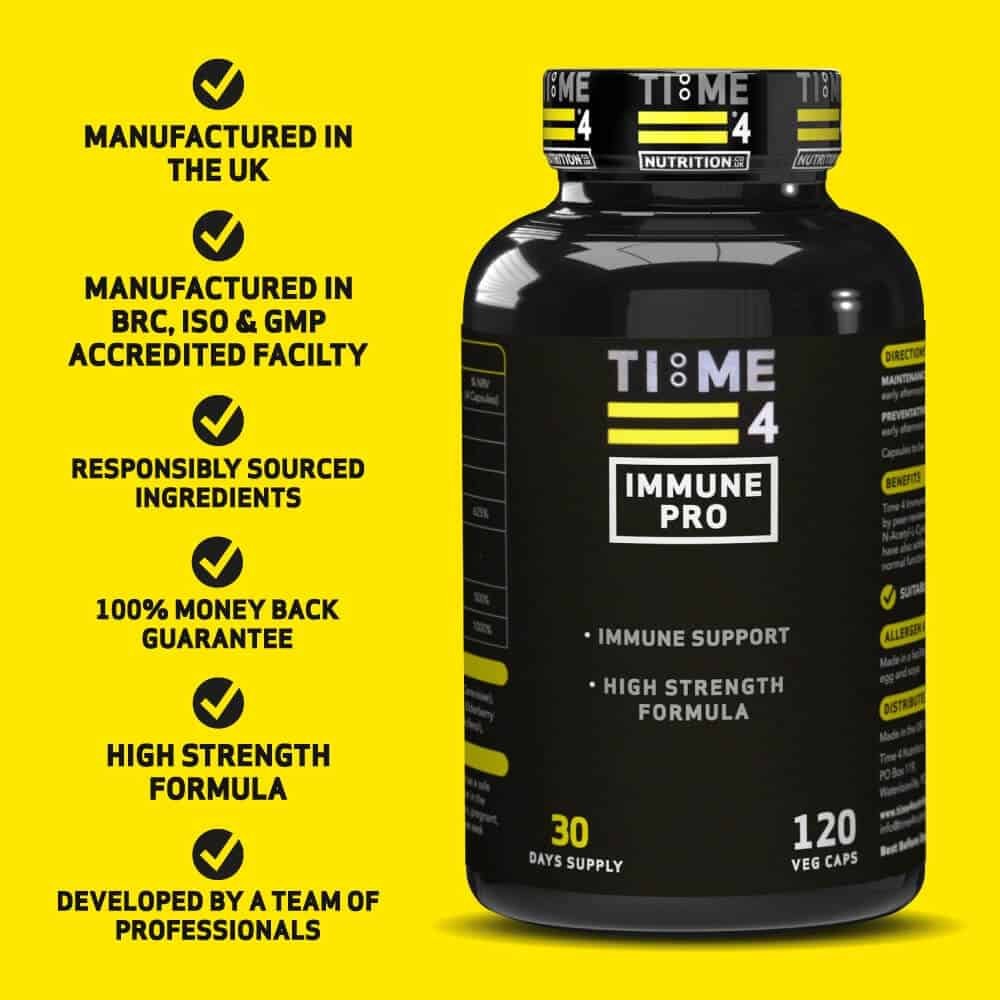MANUFACTURED IN THE UK – Time 4 Immune Pro our Immune Booster Supplement was developed in the UK by a team of professionals from the fields of nutrition, biochemistry & exercise with decades of industry experience and is manufactured in a BRC, ISO & GMP accredited facility to give you complete peace of mind. We employ an evidence-based approach to all our products and provide access to peer-reviewed research papers from some of the leading scientific journals to support their use. A full explanation of all technical terminology is provided so that you fully understand exactly what is contained within our supplements and the potential benefits for health and performance they may provide you with. While many of our products are aimed at increasing muscle size and strength and reducing body fat, we also understand how important your health is and have developed various supplements that promote general health and well-being to enable you to become the best you can be.