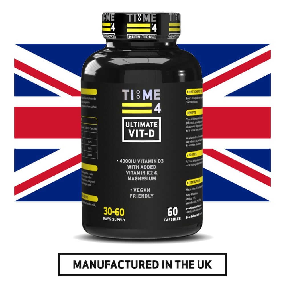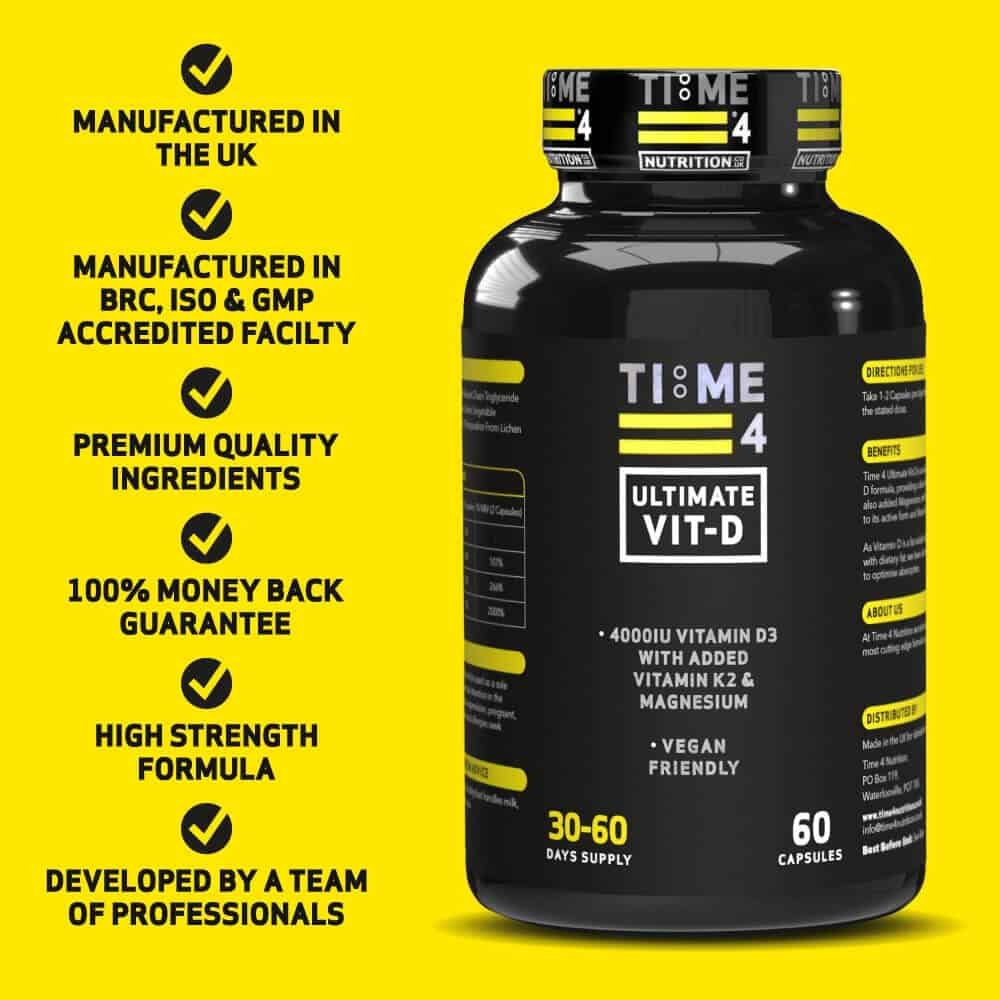 MANUFACTURED IN THE UK – Time 4 Ultimate Vit-D our high strength Vitamin D formula was developed in the UK by a team of professionals from the fields of nutrition, biochemistry & exercise with decades of industry experience and is manufactured in a BRC, ISO & GMP accredited facility to give you complete peace of mind. We employ an evidence-based approach to all our products and provide access to peer-reviewed research papers from some of the leading scientific journals to support their use. A full explanation of all technical terminology is provided so that you fully understand exactly what is contained within our supplements and the potential benefits for health and performance they may provide you with. While many of our products are aimed at increasing muscle size and strength and reducing body fat, we also understand how important your health is and have developed various supplements that promote general health and well-being to enable you to become the best you can be.